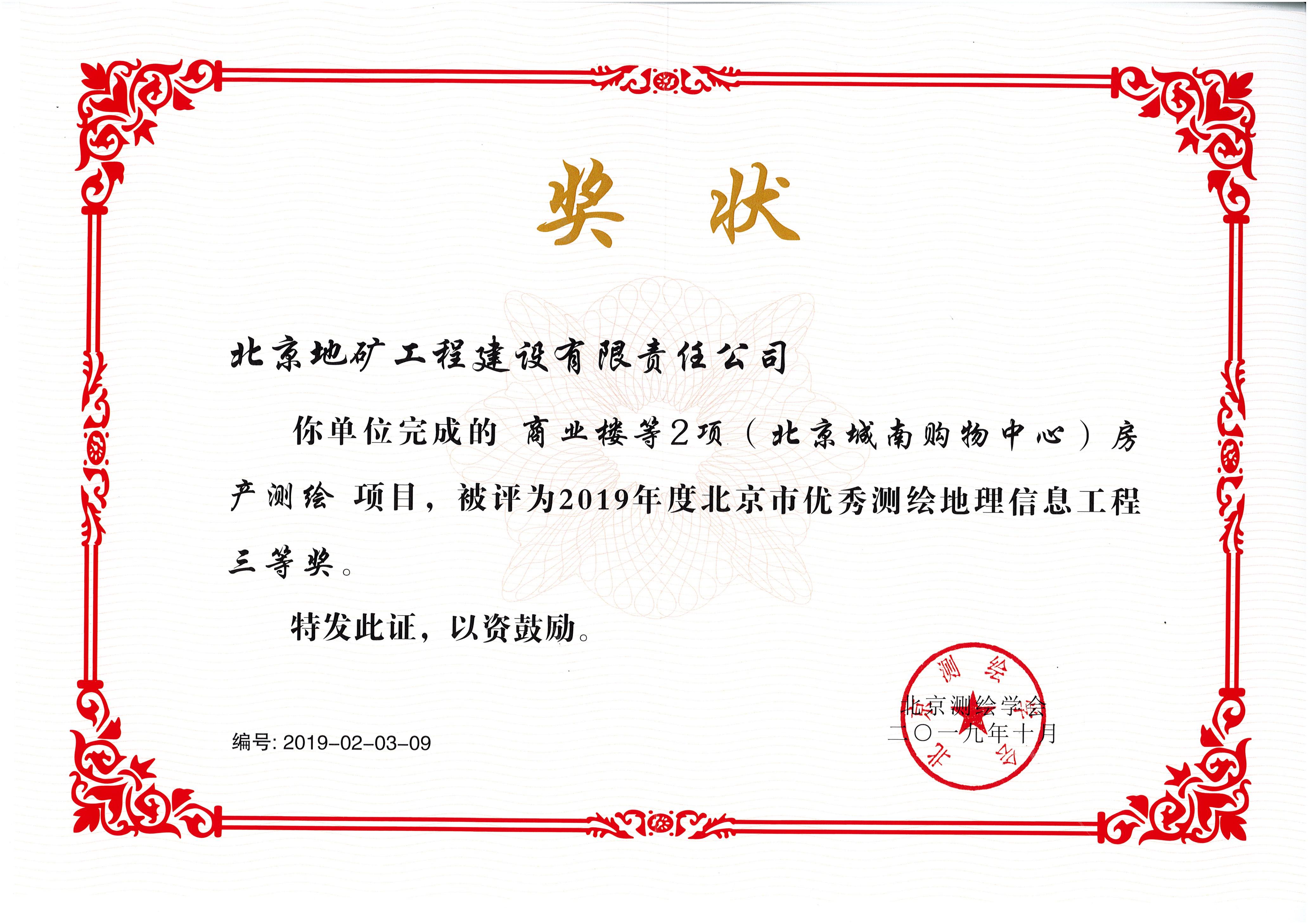 2019年北京城南購物中心測繪獎狀