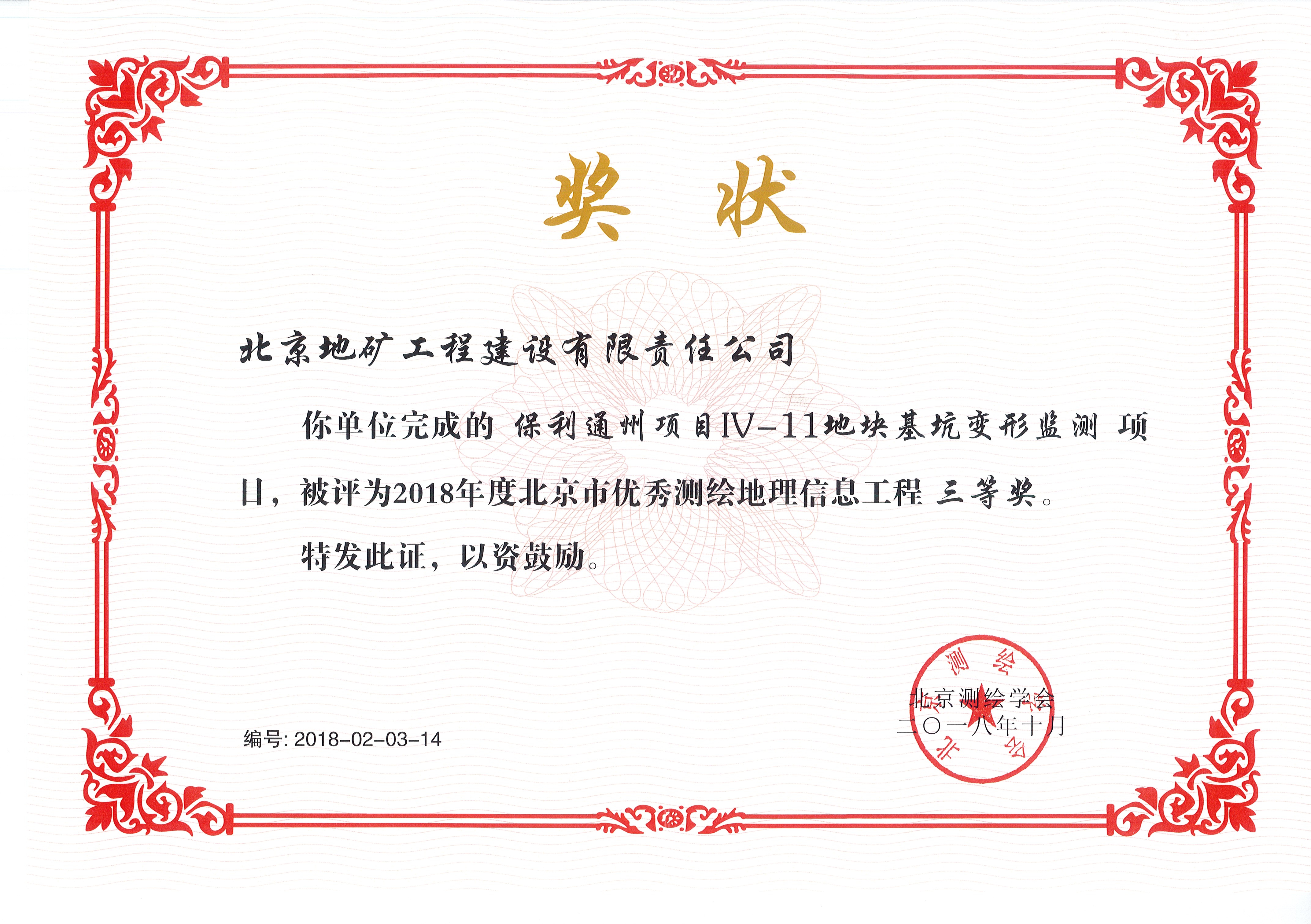 2018年保利通州項目測繪獎狀